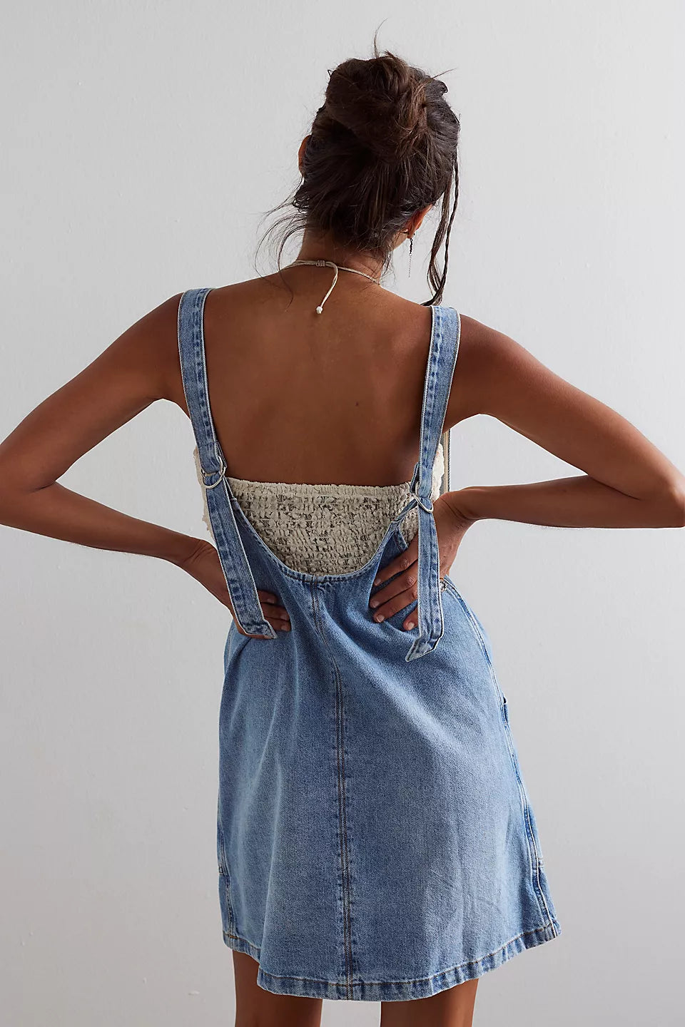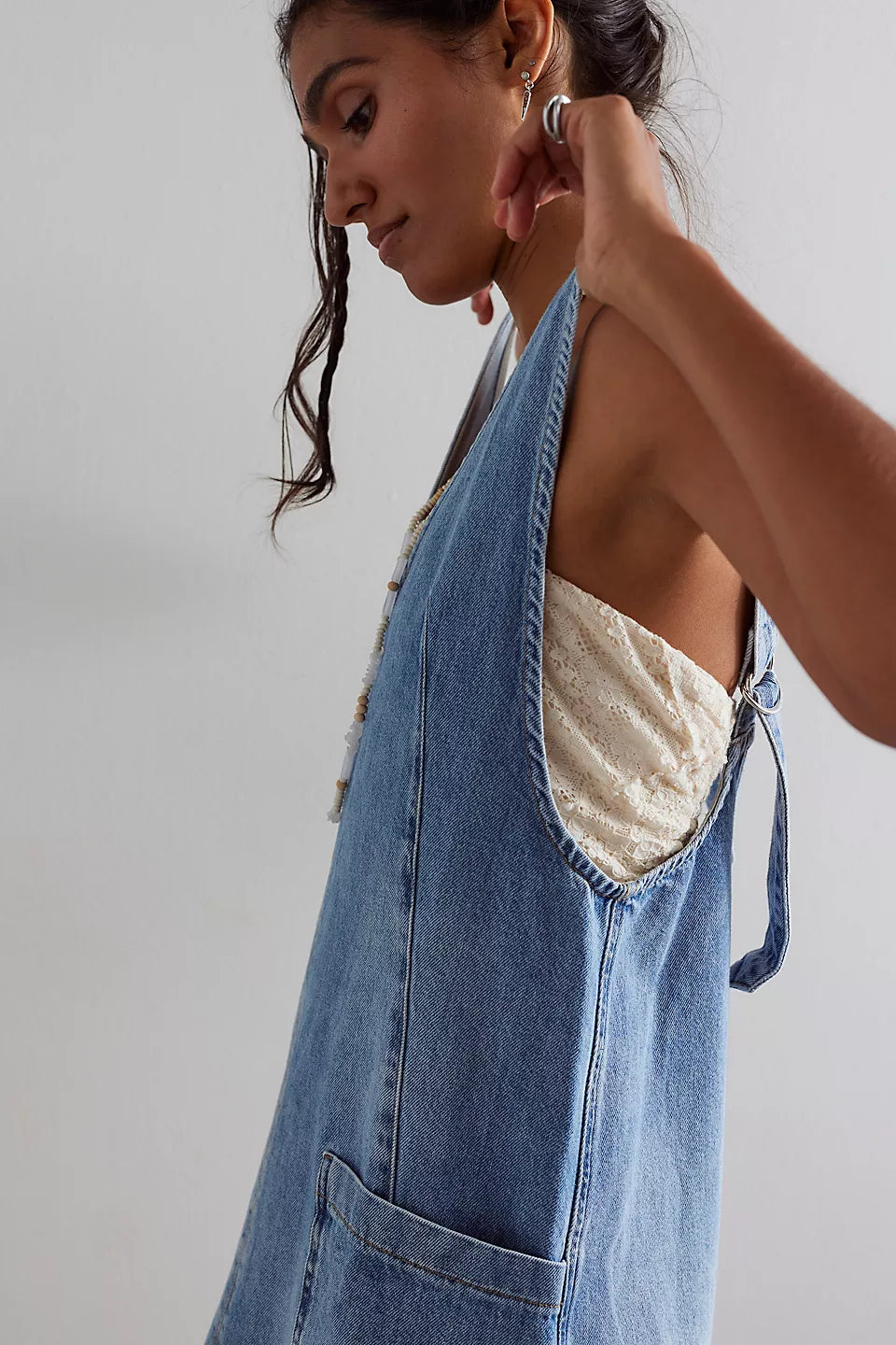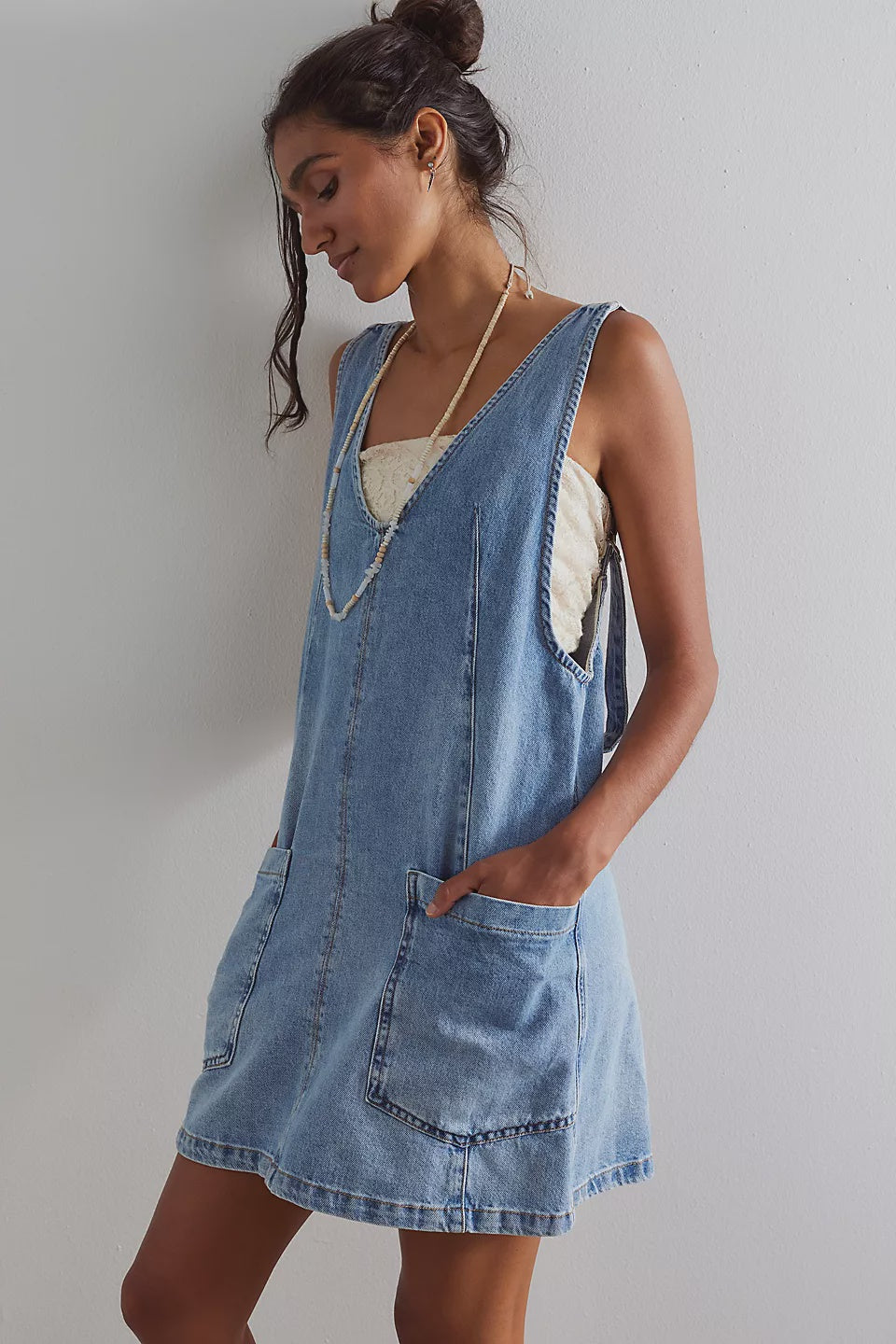 High roller skirtall scoop neckline, adjustable buckle straps, seamed paneling, dropped pouch pockets